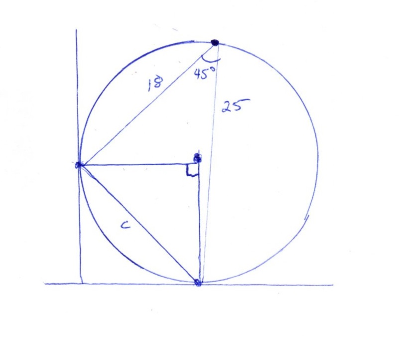 c^2 = 18^2 + 25^2 - 2 (18)(25)(cos 45) = 312.604