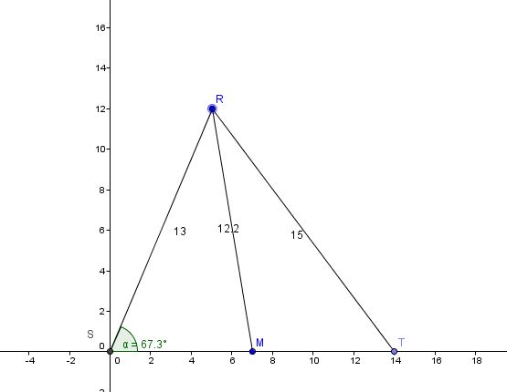 [13^2 + 14^2 - 15^2] / [ 2(13) (14) ] = cos RST