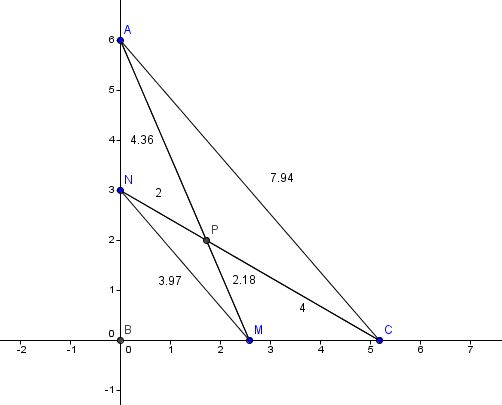 Now......MB = 3 and BN = 4...and angle ABC is right....so....triangle MBN is a 3-4-5 Pythagorean Triple right triangle with MN = 5 and the area = (MB * BN)/2 = (3*4)/ 2 = 6