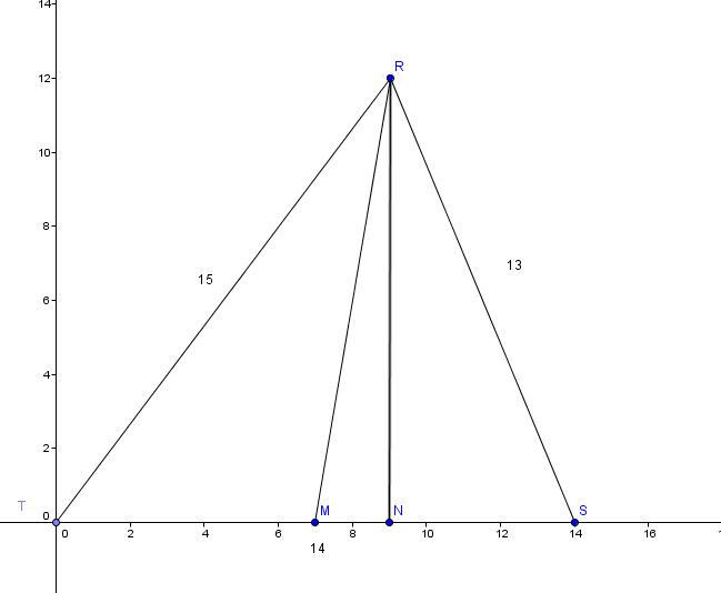 Now....in triangle RMS draw altitude RN and note that angle RSN = angle RST........since triangle RNS is a right triangle with hypotenuse RS = 13......then.......if cos RST = 5/13...it must be that SN = 5.......so triangle RNS has a hypotenuse of 13 and one leg = 5.....so...the other leg (RN) must = 12