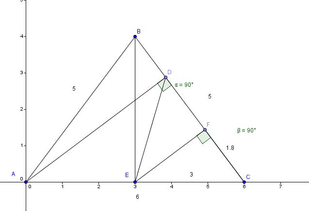 And in triangle ECB the side opposite angle EBC = 3 and the side opposite the similar angle FEC in triangle FCE - FC - is 3/5 ths of this = (3/5) (3) = 9/5 = 1.8.......but DC was shown to be 3.6....so DC - FC = DF ...and..... 3.6 - 1.8 = 1.8 = DF