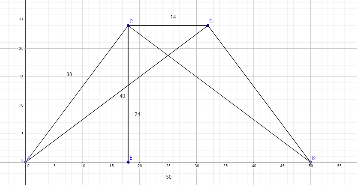 So....the area of the trapezoid = (1/2) height ( sum of the bases) = (1/2) (24) ( 50 + 14) = 12 ( 64) = 768 cm'^2