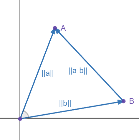 \(\cos(\theta) = \frac{{||a||}^{2}+{||b||}^{2}-{||a-b||}^{2}}{2||a||\,||b||}\).