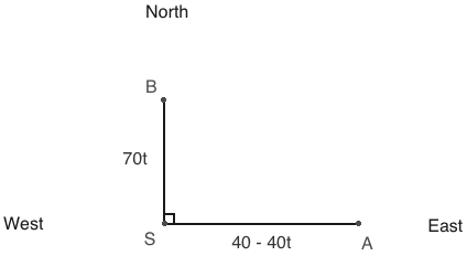 So after t hours, the distance between A and B = √[ (70t)2 + (40 - 40t)2 ]